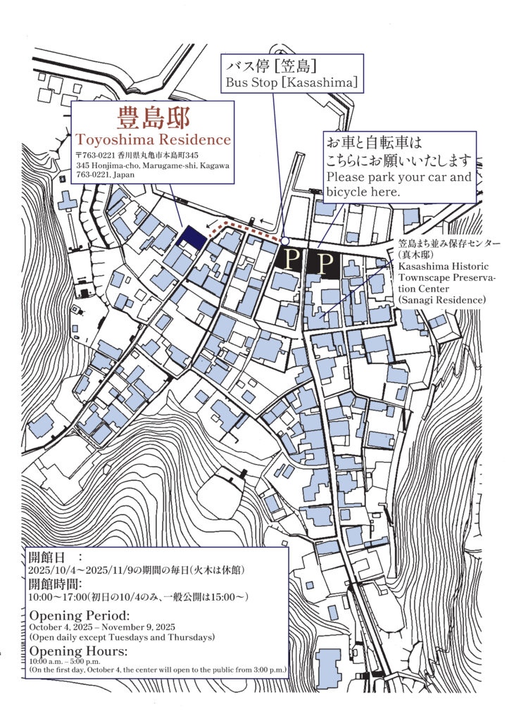 As the Toyoshima Residence does not have parking or bicycle facilities, visitors are courteously requested to make use of the parking area situated by the seaside.